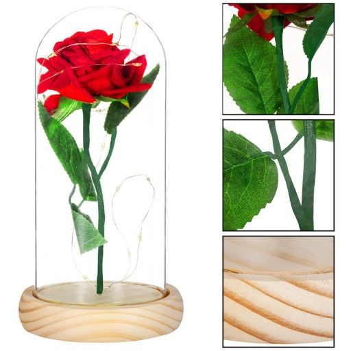 Róża wygląda ultra realistycznie, do złudzenia przypomina prawdziwy kwiat. Efekt wizualny - połączenie szklanego klosza, światła i kwiatu, robi duże wrażenie i nasuwa na myśl bajkowy klimat.