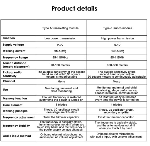 - Sposób odbioru: radio FM 88 - 108 MHz, z telefon z funkcjami odbioru sygnału FM - po uprzednim odnalezieniu częstotliwości na jaką jest zestrojony moduł.
