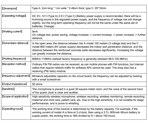 - Odległość odniesienia: otwarty grunt 100 metrów, 10-30 metrów przy wewnętrznych przeszkodach środowiskowych (test przeprowadzony przy napięciu 3 V, zwiększenie napięcia zwiększa zasięg) - nie należy przekraczać napięcia dopuszczalnego gdyż może to doprowadzić do uszkodzenia modułu.