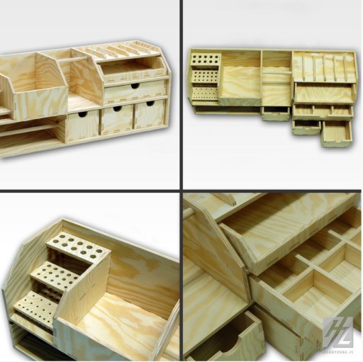 - Praktyczne Schowki: Specjalne schowki na farby, pędzle, nożyczki, kleje i inne niezbędne akcesoria modelarskie, gwarantujące uporządkowaną przestrzeń roboczą.