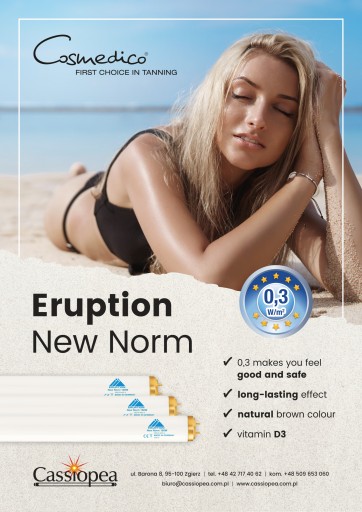 Seria lamp Eruption pozwala nam uzyskać wysoką jakość opalenizny w krótkim czasie opalania za bardzo atrakcyjną cenę. Seria tych lamp produkowana jest w fabryce Narvy w Niemczech co jest pewnością najwyższej jakości. W tej serii znajdują się dwie lampy 160W i 200W o wysokim współczynniku 3,6% UVB/UVA oraz lampy w nowej normie europejskiej 0,3.