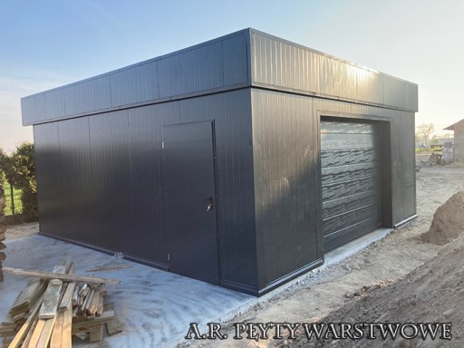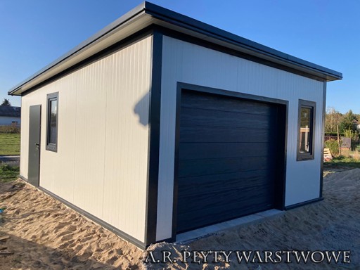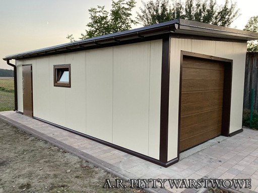 Garaż jednostanowiskowy z płyty warstwowej z wkładem styropianowym gr.10 cm ściana i dach o powierzchni 35 m2,