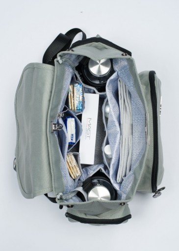 - dwie boczne kieszenie zapinane na zamek (jedna z nich przeznaczona jest do przechowywania wilgotnych chusteczek)