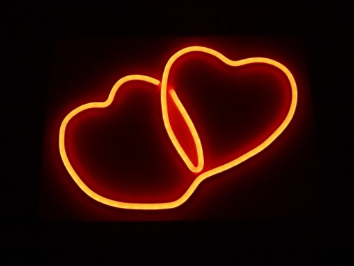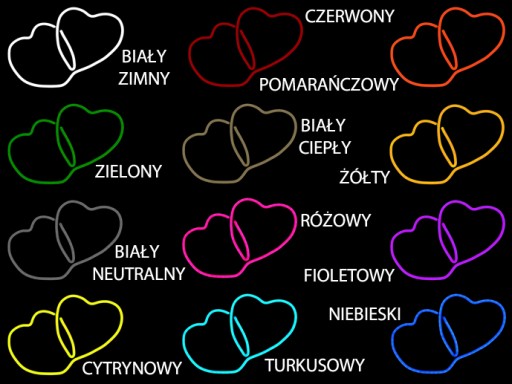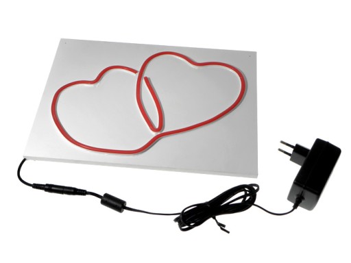 Dwa serca wykonane z neonu LED FLEX. Neon umieszczony jest na płycie PCV w kolorze białym w specjalnie wyfrezowanych do tego celu rowkach. W komplecie zasilacz. Wystarczy całość podłączyć do sieci 230V. Bardzo dobre na prezent na przykład na walentynki. Może służyć jako ozdoba pomieszczeń. Łatwo przymocować je do ściany, powiesić lub postawić na stoliku.