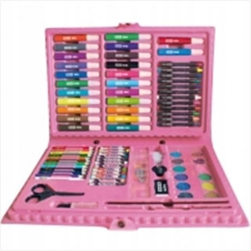 Parametry: - 86 elementów - 25 flamastrów - 12 kredek świecowych - 12 pasteli olejnych - 12 kredek - 12 kolorów farbki akwarelowej - linijka - ołówek - pędzelek - gumka - paletka - gąbka - 4 spinacze - nożyczki - temperówka