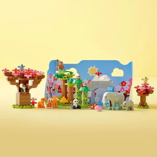 Wszyscy mali miłośnicy zwierząt będą zachwyceni nieograniczonymi możliwościami zabawy, które daje ten zestaw z wieloma dzikimi azjatyckimi zwierzętami. Można tu spotkać słonia i słoniątko, dużą i małą pandę, tygrysa i tygrysiątko, małpę, dwa ptaki oraz dwie pandy czerwone. W zestawie są również bambusy, drzewa wiśniowe i składana trójwymiarowa plansza, a nawet klocek odtwarzający realistyczne dźwięki i odgłosy zwierząt.