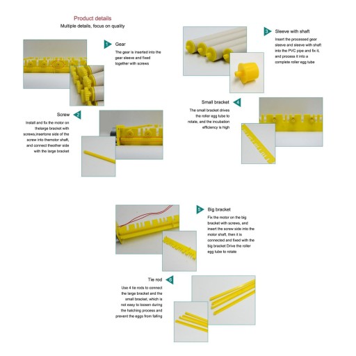 Regulowana przestrzeń, automatyczna obracarka jaj całkowicie obraca jaja o 360 °, aby wyeliminować ręczną obsługę i poprawić szybkość.