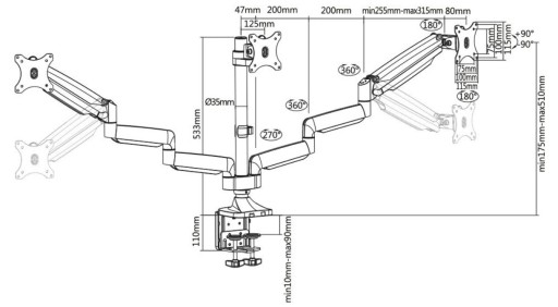 Wysokość monitorów LCD jest regulowana dla wszystkich 3 monitorów oddzielnie (sprężyna gazowa tylko w przypadku 2x ramion bocznych, regulacja ramienia środkowego musi być wykonana poprzez przesuwanie monitor w górę i w dół).