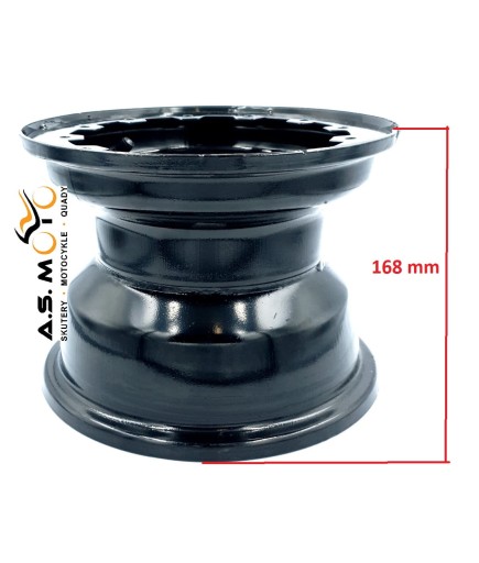 Felga tylnaa przeznaczona do quadów ATV 110, 125. Dedykowana do quadów Benyco Hercules, Gecon 125. Posiada mocowanie do ozdobnych osłon (beadlock). Felga zdemontowana z nowego pojazdu. Posiada ślady montażu na otworach mocujących. W zestawie wentyl.