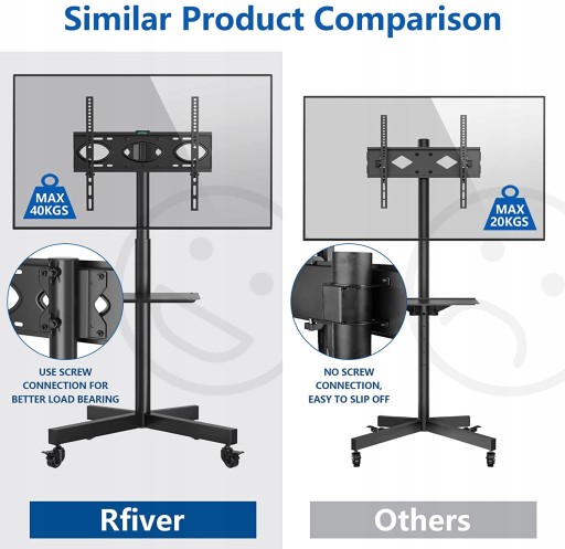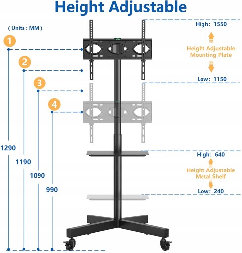 - Koła 360°. Mobilny wózek TV z 4 wytrzymałymi kółkami 360° sprawia, że jest nieruchomy lub mobilny.