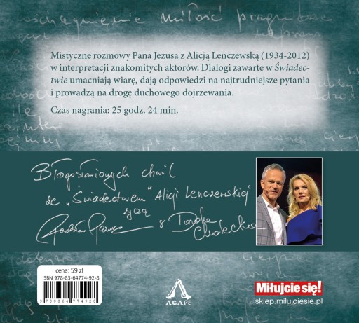 Dialogi zawarte w Świadectwie napisane są prostym i zrozumiałym językiem, dzięki czemu treść trafia do każdego. Pierwsza cześć duchowego dziennika mistycznych rozmów Pana Jezusa z Alicją Lenczewską.
