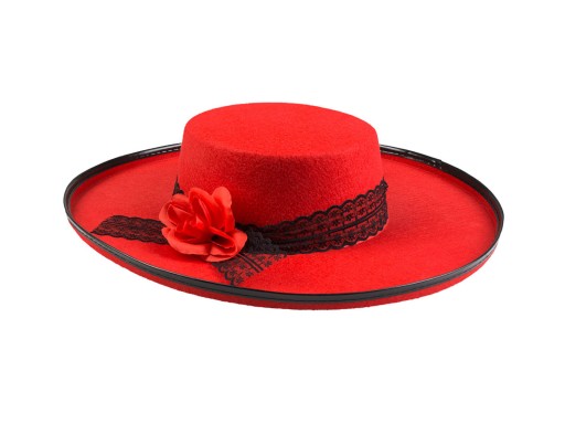 Czerwony kapelusz z koronką i różyczką. Idealny dodatek do stroju Hiszpanki.