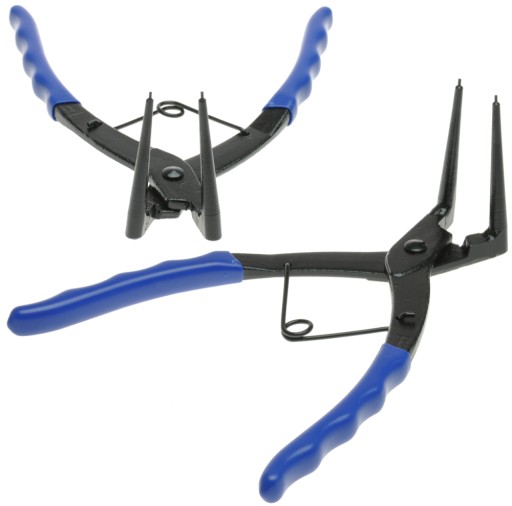 Szczypce wewnętrzne wygięte do zakładania i wyjmowania pierścieni zabezpieczających Segera z zacisków hamulcowych samochodów różnych marek VW, Audi, Mercedes i innych.