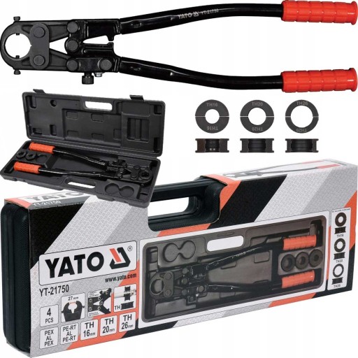 Ręczna praska hydrauliczna marki YATO z zestawem 3 matryc typu TH, przeznaczona do zaciskania złączek na rurach PEX-AL-PEX i PERT-AL-PERT. Pozwala na precyzyjne i szczelne zaciskanie złączek.