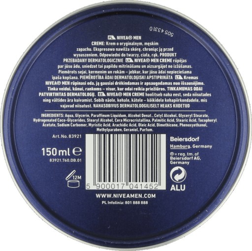 Nivea Men Krem Twarz- Ciało- Ręce 150ml Nivea Men Creme stworzony specjalnie dla mężczyzn, z aktywną witaminą E, przywraca nawilżenie skóry w zaledwie kilka sekund, a jego szybko wchłaniająca się formuła zapobiega wysuszaniu skóry.