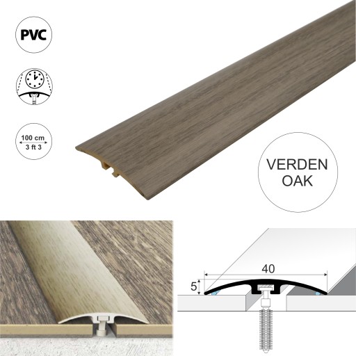 Doskonałej jakości płaska plastikowa listwa podłogowa w kolorze dąb verden. Idealna do łączenia podłóg drewnianych, laminowanych, winylowych lub wyłożonych płytkami, które są na tym samym poziomie.