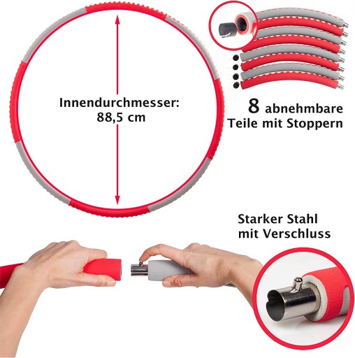 - Waga hula hop: hula hop składa się z 8 elementów, które jednym kliknięciem można szybko i łatwo zmontować i zdemontować. Elementy na hula hop można uzupełnić ciężarkiem, dzięki czemu idealnie nadaje się dla początkujących i zaawansowanych użytkowników