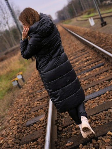 DŁUGI PŁASZCZ ZIMOWY PIKOWANY CZARNY Z KAPUTREM;