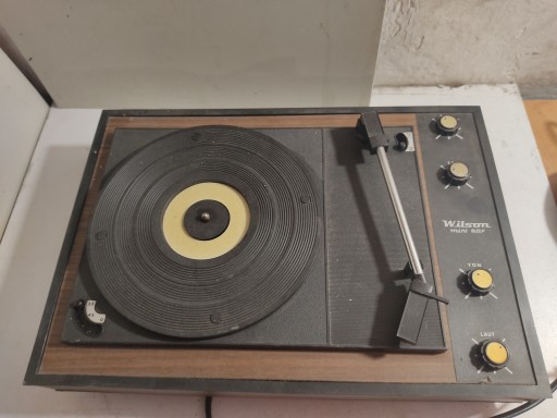 Wilson mini boy. Teoretycznie działa, gra, dokładnie nie mam go jak sprawdzić, płyty mam porysowane więc wkładki nie sprawdzę czy dobrze działa. Potencjometry trzeszczą.