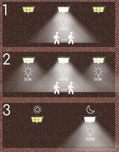 2. Lampa LED włącza się po zmierzchu po wykryciu ruchu. Następnie lampa samoczynnie przełącza się w tryb oszczędny (50% mocy) po kilkudziesięciu sekundach jeśli czujnik nie zarejestruje ruchu.
