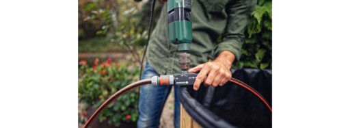 Pompę GARDENA 149020 wystarczy zamontować na wiertarce elektrycznej. Wał napędowy pasuje do zacisku każdej standardowej wiertarki elektrycznej (Ø 8 mm). Dzięki złączom Original GARDENA pompa jest natychmiast gotowa do działania.