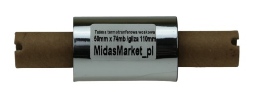 Czarna taśma TTR (Thermal Transfer Ribbon)/kalka/folia termotransferowa WOSKOWA o szerokości 50mm i długości 74mb nawinięta na gilzę/rolkę o średnicy 1/2" (13mm) i długości 110mm.