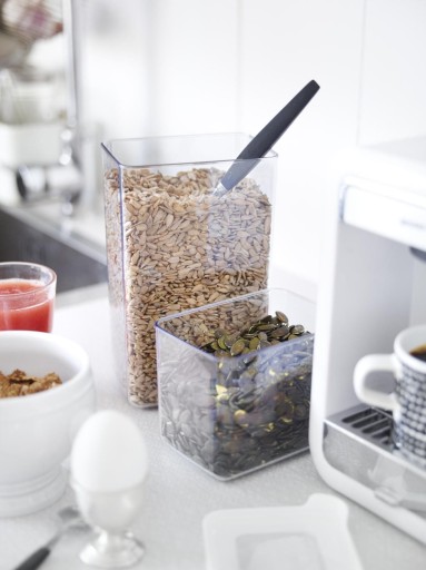 Pojemniki idealnie nadają się do ustawiania w szufladach kuchennych. Dzięki przezroczystemu okienku w pokrywie z łatwością odnajdziesz w szufladzie potrzebny produkt. W przeciwieństwie do innych pojemników tutaj pokrywa ściśle przylega do pojemnika - dlatego wyciągając pojemnik z szuflady możesz złapać za pokrywkę bez obaw o wysypanie zawartości z pojemnika.