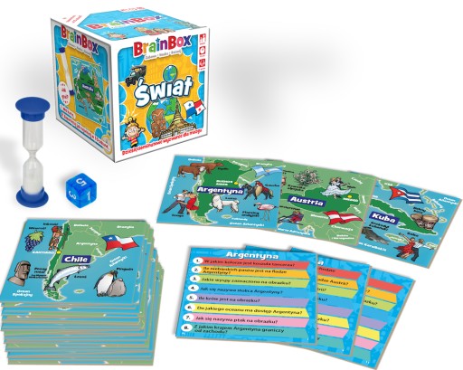 Wspólna zabawa - wspólna nauka geografii!Flagi, mapy, stolice i symbole poszczególnych państw przestaną być zagadką dzięki BrainBox - Świat! Na 55 kartach znajdziesz informacje o najważniejszych krajach, a angażujący sposób rozgrywki sprawi, że Twoje dziecko bez wysiłku będzie poszerzało swoją wiedzę z zakresu geografii. Czym jest BrainBox?To seria wyjątkowych gier edukacyjnych, które będą wspierały rozwój Twoich dzieci lub podopiecznych na każdym etapie nauki. Wykorzystując dynamiczną i angażującą zabawę, gry z linii BrainBox pozwalają rozwijać wiedzę, a także wspierają trening pamięci i spostrzegawczości, czyli umiejętności kluczowych dla rozwoju. Każde pudełko to zestaw kart, które po jednej stronie mają obrazek (należy przyjrzeć mu się przez określony czas), a z drugiej zestaw pytań, sprawdzających nie tylko naszą pamięć, ale też wiedzę z zakresu danego przedmiotu.Na czym to polega? Weź kartę z pudełka i odwróć klepsydrę. Przyglądaj się obrazkowi na karcie tak długo, jak przesypuje się piasek. Możesz przekręcić klepsydrę jeszcze raz, jeśli potrzebujesz więcej czasu.Przekaż kartę innemu graczowi i rzuć kością. Liczba na kości wskazuje, na które pytanie musisz odpowiedzieć (na przykład gdy wyrzucisz 2, odpowiadasz na pytanie numer 2).Gracz, któremu została przekazana karta, czyta na głos pytanie, na które musisz udzielić odpowiedzi. Następnie sprawdza Twoją odpowiedź, patrząc na obrazek na drugiej stronie karty.Jeśli odpowiedź jest prawidłowa, zatrzymaj kartę. Jeśli jest błędna, odłóż kartę do pudełka. Teraz kolej na następnego gracza.Gracz, który zgromadzi najwięcej kart po upływie 10 minut, wygrywa!Dlaczego pokochasz tę grę?To połączenie doskonałej, dynamicznej zabawy z realnym rozwijaniem wiedzy z konkretnych dziedzin.Testy wykazały, że gry z serii BrainBox stanowią doskonałe rozszerzenie nauki przedszkolnej i szkolnej; nadają się do wykorzystania zarówno w szkole, jak i w domu.BrainBoxy są dostosowane do wspólnej zabawy dzieci i dorosłych, by była ona satysfakcjonująca dla obu stron.Gry powstają w etycznych warunkach, z materiałów pochodzących z recyklingu i zdatnych do ponownego przetworzenia.
