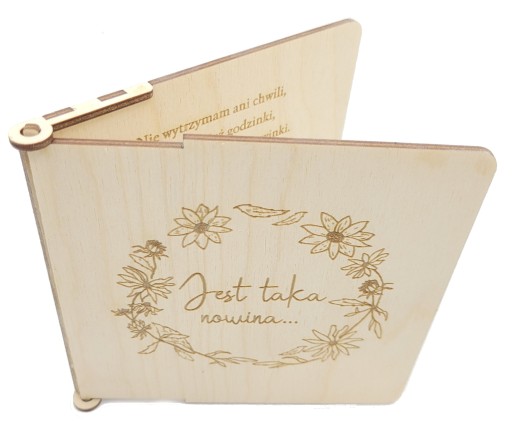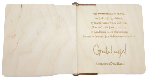 Drewniana kartka z grawerem "Zostaniecie Dziadkami" to wspaniały sposób na przekazanie radosnej informacji dla przyszłych dziadków. Kartka wykonana jest z naturalnego drewna, co nadaje jej niepowtarzalnego i ekologicznego wyglądu. Na powierzchni kartki znajduje się wygrawerowany napis "Zostaniecie Dziadkami", który podkreśla wyjątkowość i niepowtarzalność tego momentu. Kartka jest solidna i trwała, dzięki czemu stanowi wyjątkową pamiątkę na długie lata. Można ją również postawić na półce czy biurku jako ozdobę, co sprawi, że każdorazowo przywołamy piękne wspomnienia. Taki prezent na pewno wywoła uśmiech na twarzy przyszłych dziadków i będzie wspaniałym sposobem na podzielenie się z nimi radosną nowiną.