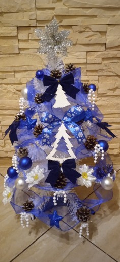 Choinka o kolorze np. złoto-niebieski z organzą to choinka z złotą organzą i złoto-niebieskimi dodatkami.