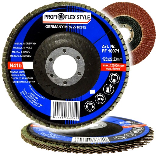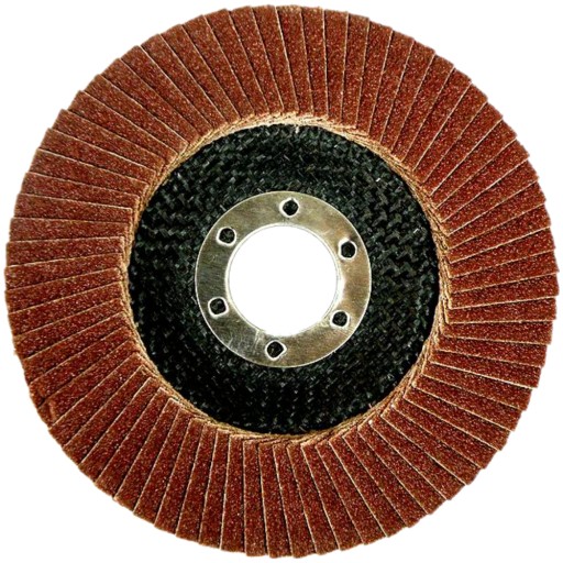 Ściernica listkowa talerzowa zbudowana z listków (lamelek) z płótna ściernego z ziarnem elektrokorundowych nałożonych równomiernie wachlarzowato na korpusie z włókna szklanego.