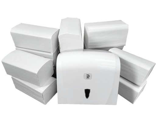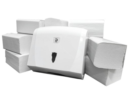 Ręczniki papierowe w składance typu ZZ ok.1900 sztuk wraz z eleganckim podajnikiem DK041 w kolorze białym.