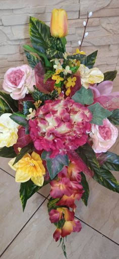 Wykonany na uniwersalnym flakonie plastikowym zabetonowanym z choiną sztuczną, gotowy tylko do włożenie do wazonu! Flakon ma średnice 12 cm od góry i 7 cm od dołu, ma 10 cm wysokości. Kompozycja do wazonu ma ok. 60 cm wysokości i 45 cm szerokości.