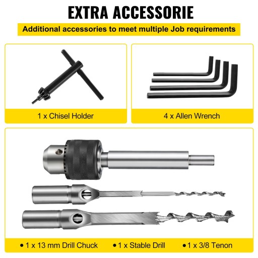 · 【 DODATKOWE AKCESORIA 】 - Akcesoria tego produktu obejmują uchwyt wiertarski 13 mm, frez do czopów 3/8, uchwyt dłuta 19 mm i cztery klucze imbusowe, które zapewniają więcej opcji dla tego drążonego dłutaka.