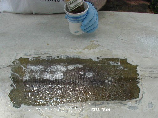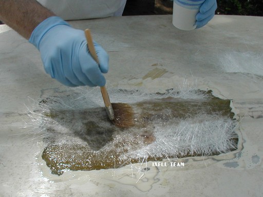 W ciągu maksymalnie 10 minut (przy 20 st C) nanieść żywicę na oczyszczone miejsce. Następnie nałożyć i docisnąć pędzlem lub wałkiem przyciętą matę i ponownie nanieść żywicę.