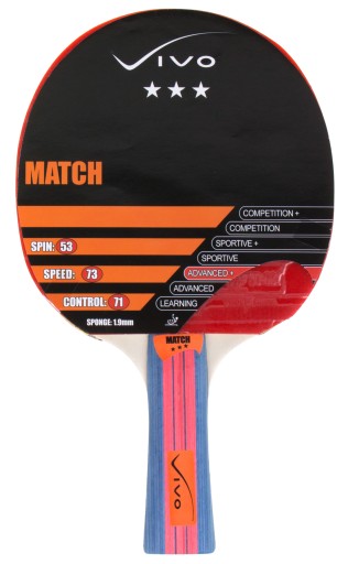 Rakietka do tenisa stołowego marki Vivo Match, wykonana z wykorzystaniem wysokiej jakości materiałów gumy, gąbki oraz drewna. Złożona jest z pięcio-warstwowej sklejki oraz gąbki o grubości 1,9 mm. Okładziny deski przeznaczone są do zaawansowanej gry ofensywnej, gwarantując doskonałe parametry znajdujące się na poziomie: szybkość 73, rotacja 53 i kontrola 71. Całość rakietki wykonano z naturalnego drewna, dzięki czemu oferuje ona niespotykaną moc oraz zwiększony obszar gry. Podczas projektowania rączki, zastosowano technologie BBS, polegającą na odpowiednim wyważeniu środka ciężkości, który w tym przypadku zbliża się do środka aktywnej strefy, co znacznie przyśpiesza uderzenia. Jest to rodzaj rakietki do tenisa stołowego, który doceni każdy gracz, a to za sprawą jej niezwykłych właściwości i osiągów.