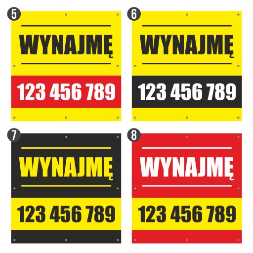 Tekst: Duże, czytelne litery z wyraźnymi hasłami „Sprzedam” i „Wynajmę”. Tekst w kolorze kontrastującym z tłem, aby był widoczny z dużej odległości.