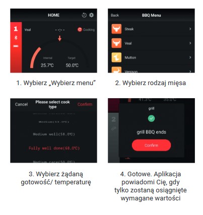 Oprócz wartości ręcznych można również wybrać kilka wstępnie ustawionych programów dla różnych rodzajów mięsa. Dzięki zasięgowi do 50 metrów możesz oddalić się od przygotowywanej potrawy i nadal mieć nad nią kontrolę. Jest to przydatne na przykład podczas letnich grillów.