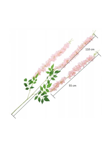 Zwisy kwiatowe z wisterii wykonane są z materiału, osadzone na łodydze z drutu zaciągniętej tworzywem sztucznym i wykończone bukietami liści.