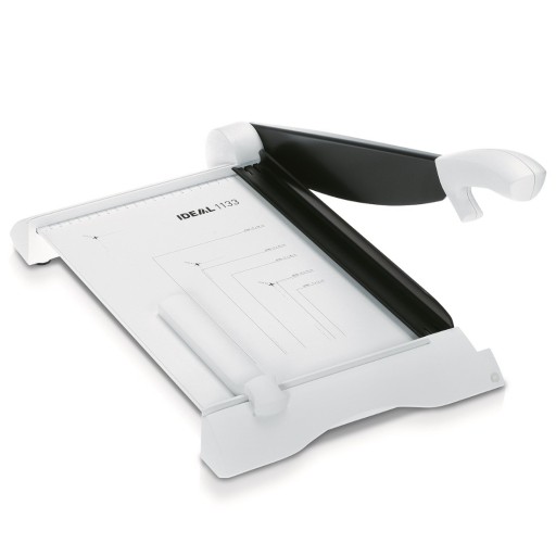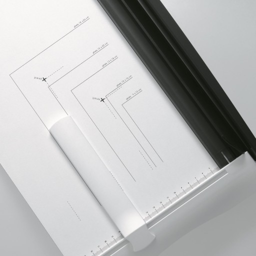 Obcinarka biurowa A4 wyposażona w specjalnie naostrzony, bezpieczny nóż, niewymagający osłony. Brak tej osłony powoduje zmniejszenie gabarytów urządzenia. Obcinany materiał dociskany jest ręcznie za pomocą listwy. Przesuwny ogranicznik formatu ułatwia przygotowanie dokumentu do cięcia.