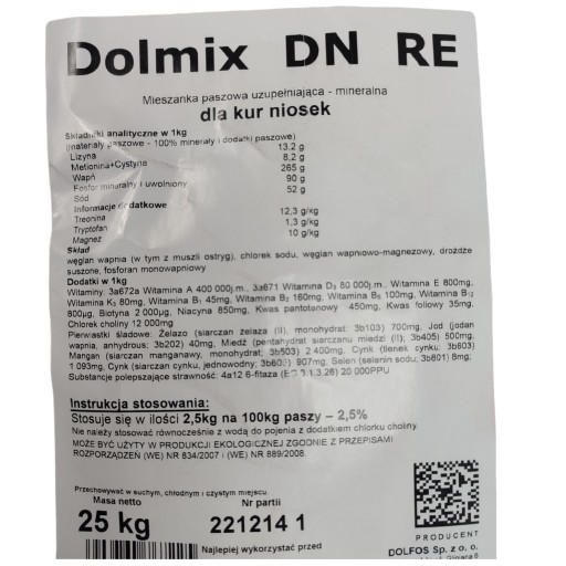 Dolmix DN jest to mieszanka paszowa mineralna uzupełniająca dla kur niosek, które są utrzymywane w chowie wolno wybiegowym. Mieszanka zawiera zestaw zbilansowanych dokładnie witamin, makro i mikroelementów oraz aminokwasów niezbędnych do prawidłowego funkcjonowania i produkcyjności niosek. Dolmix DN zawiera muszle ostryg jako jedno ze źródeł wapnia, które powodują dobrą twardość i wykształcenie jaj. Podnosi wydajność nieśną oraz intensyfikuje zabarwienie żółtek. Mieszanka ma na celu także zapobieganie wystąpieniu stanów niedoborowych. Korzystnie wpływa na ogólną kondycję ptaków.