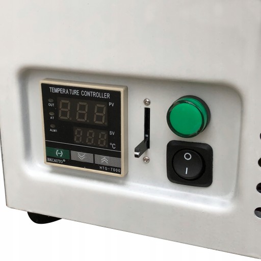 ✅ Panel sterujący wyposażony został wyświetlacz na którym przedstawiona jest aktualna temperatura kleju. Dodatkowo koło włącznika umieszczony jest suwak prędkości podawania taśmy.