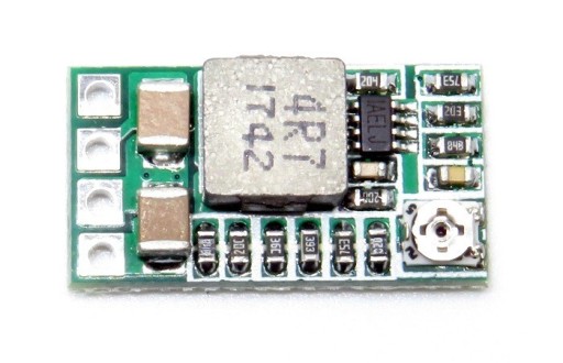 Moduł przetwornicy Step-Down z konfigurowalnym napięciem wyjściowym oraz napięciem wejściowym od 4,5 do 24 V. Napięcie na wyjściu jest modyfikowane za pomocą zworek umieszczonych na spodzie płytki - użytkownik może wybrać regulowane wyjście w zakresie od 0,8 do 17 V lub jedno ze stałych poziomów napięć: 1,8 V, 2,5 V, 3,3 V, 5 V, 9 V lub 12 V. Maksymalne obciążenie prądowe modułu wynosi do 3 A.