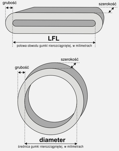 Wyobraźmy sobie, że bierzemy do rąk jedną gumkę recepturkę. Wsuwamy palce wskazujące obu dłoni w środek gumki i rozsuwamy dłonie do momentu, w którym poczujemy opór. W ten sposób, oczywiście w przybliżeniu, wyznaczyliśmy połowę obwodu gumki nierozciągniętej. Dlaczego w przybliżeniu? Nasze palce mają określoną grubość. W praktyce do wykonania pomiaru wykorzystuje się dokładną suwmiarkę, której trzpienie są dużo cieńsze i pozwalają na dużo dokładniejsze zmierzenie. Wymiar, który w ten sposób mierzymy nazywa się połową obwodu gumki nierozciągniętej, czyli LFL (z ang. Lay Flat Lenght-„długość podczas leżenia płasko”) i jest wyrażany w milimetrach (mm). Ważne: przy szczegółowym pomiarze, którego wynik podawany jest na opakowaniu bierze się pod uwagę wymiar mierzony od środka (tam, gdzie są nasze palce), nie na zewnątrz.
