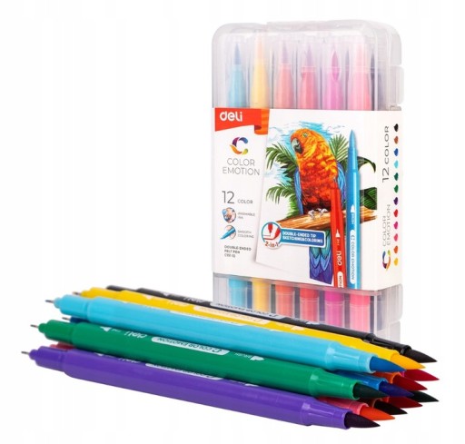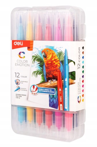 Dwustronne flamastry marki DELI spakowane w plastikowy pojemnik, dzięki któremu zawsze będziesz miał wszystkie kolory mazaków pod ręką. Z jednej strony flamastrów masz cienką końcówkę, która daje nam możliwość kolorowego zapisywania notatek, czy wyróżnienia konkretnych słów kolorem w zeszycie. Z drugiej strony masz grubszą końcówkę, która doskonale nadaje się do zakreślania ważnych informacji w książce czy notatkach lub kolorowania.