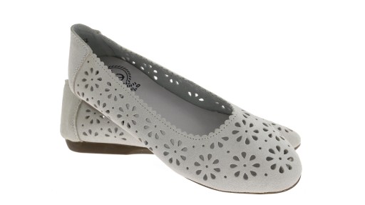 - skórzane, ażurowe balerinki w kolorze srebrnym