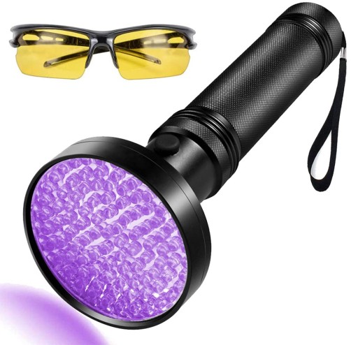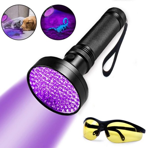 - Latarka LED UV 100 podświetla sól w wysuszonym moczu, emitując światło ultrafioletowe o długości fali 395 nm i oświetla ludzkie oko, aby odsłonić plamy.
