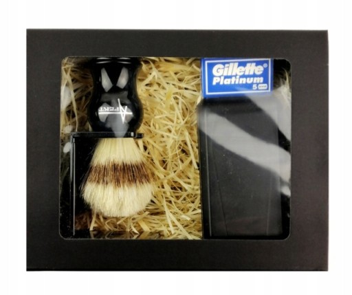 Zestaw do golenia - pędzel z naturalnego włosia na stojaku , metalowa maszynka do golenia na żyletki i żyletki w czarnym, ekologicznym, tekturowym pudełku