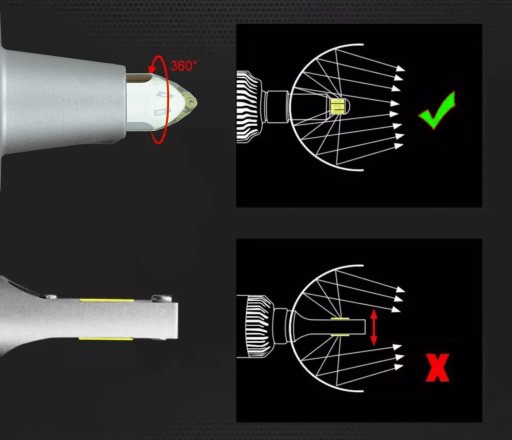 ⭐ Żarówki wyposażone są w szklaną soczewkę, która mechanicznie rozszczepia światło na 360 stopni. Zapewnia to brak niedoświetlonych, ciemnych plam przez pojazdem jak w przypadku innych żarówek LED