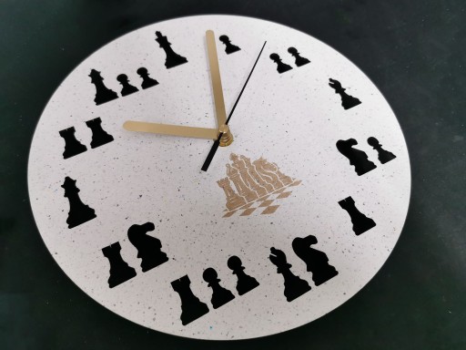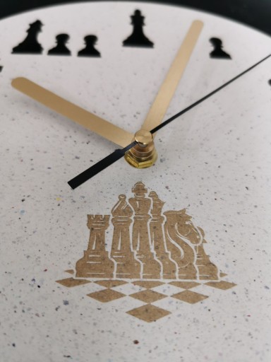 Innowacyjny zegar ścienny wykonany z tektury ekologicznej. Zegar o średnicy 25 cm, wykonany z tektury 2,5 mm. Zegar wyróżnia się tym, iż zamiast cyfr posiada figury szachowe, które swoją wartościowością odpowiadają danej liczbie godzinowej.